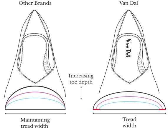 Some brands simply add height to increase volume. Our wider shoes are crafted with increased tread, as well as to depth, to ensure a truer fit and more stylish proportions.