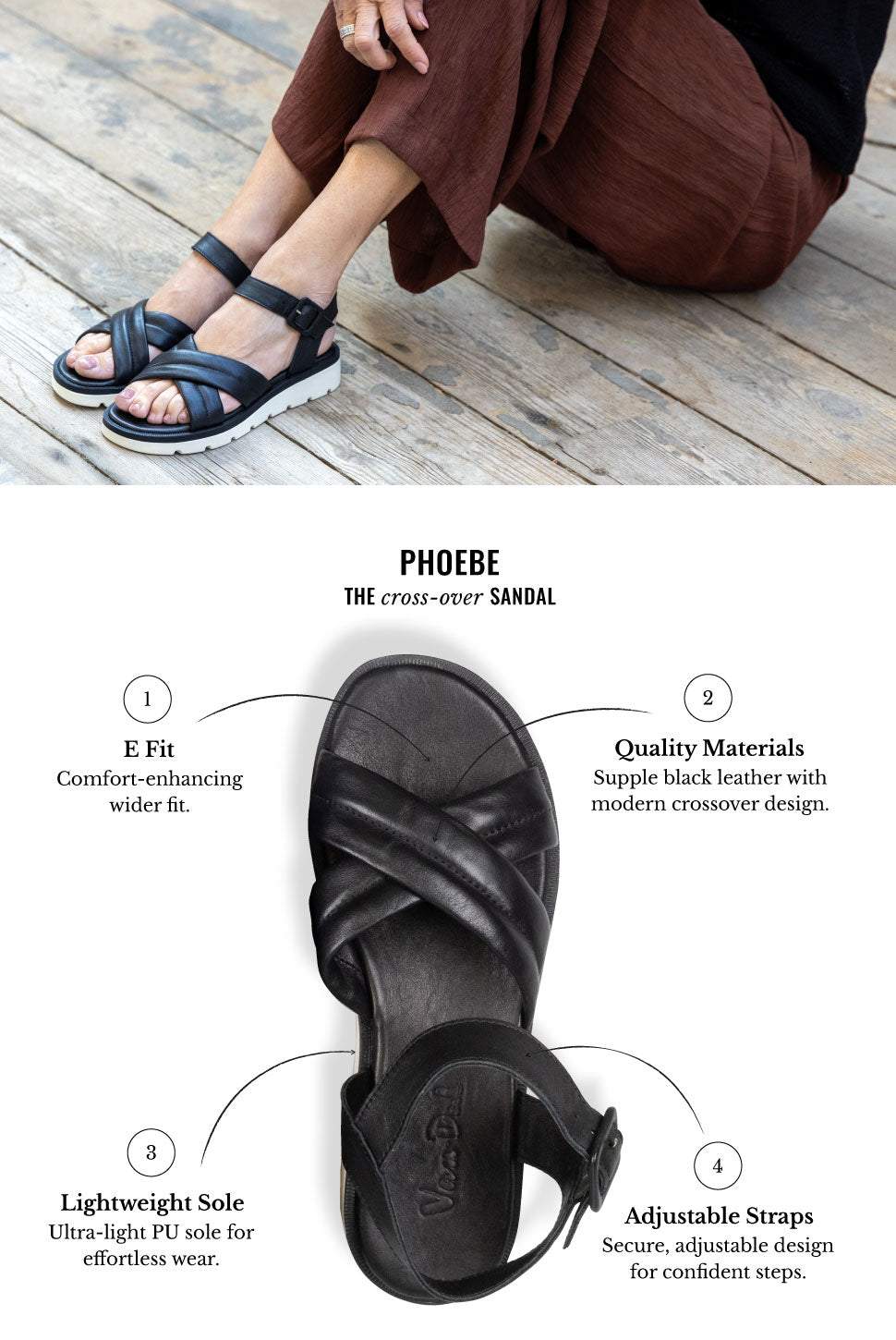 Introducing Phoebe, a contemporary sandal crafted for both comfort and style. Designed in a wide E fit and finished in soft black leather, Phoebe features an elegant crossover strap design and sits on a lightweight 35mm PU sole perfect for adding subtle lift without sacrificing flexibility.