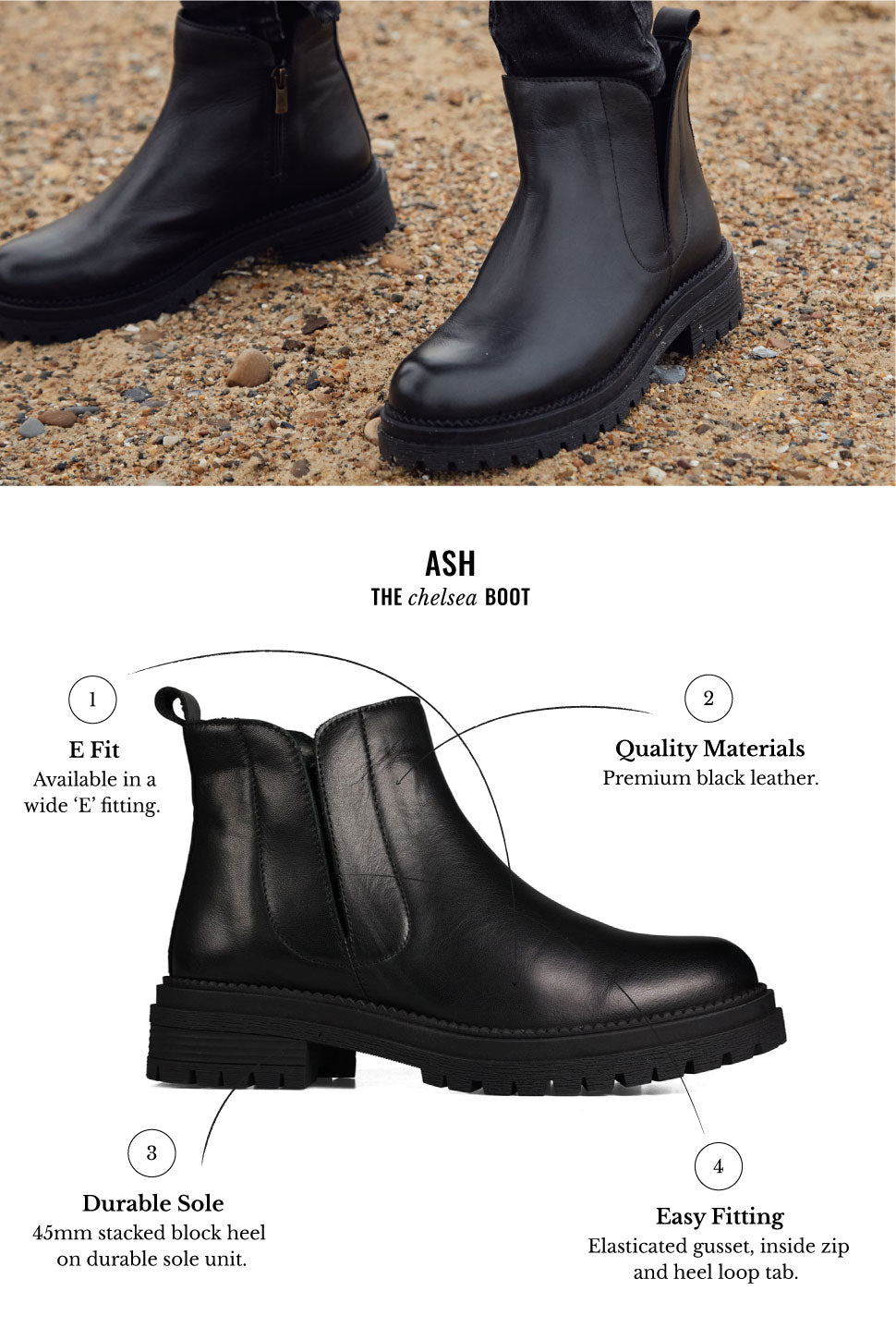 Step into everyday style with Ash, our versatile ankle boot designed to elevate your wardrobe while delivering all-day comfort. Crafted in smooth black leather with a classic silhouette, Ash offers a timeless look that pairs effortlessly with jeans, trousers or dresses.