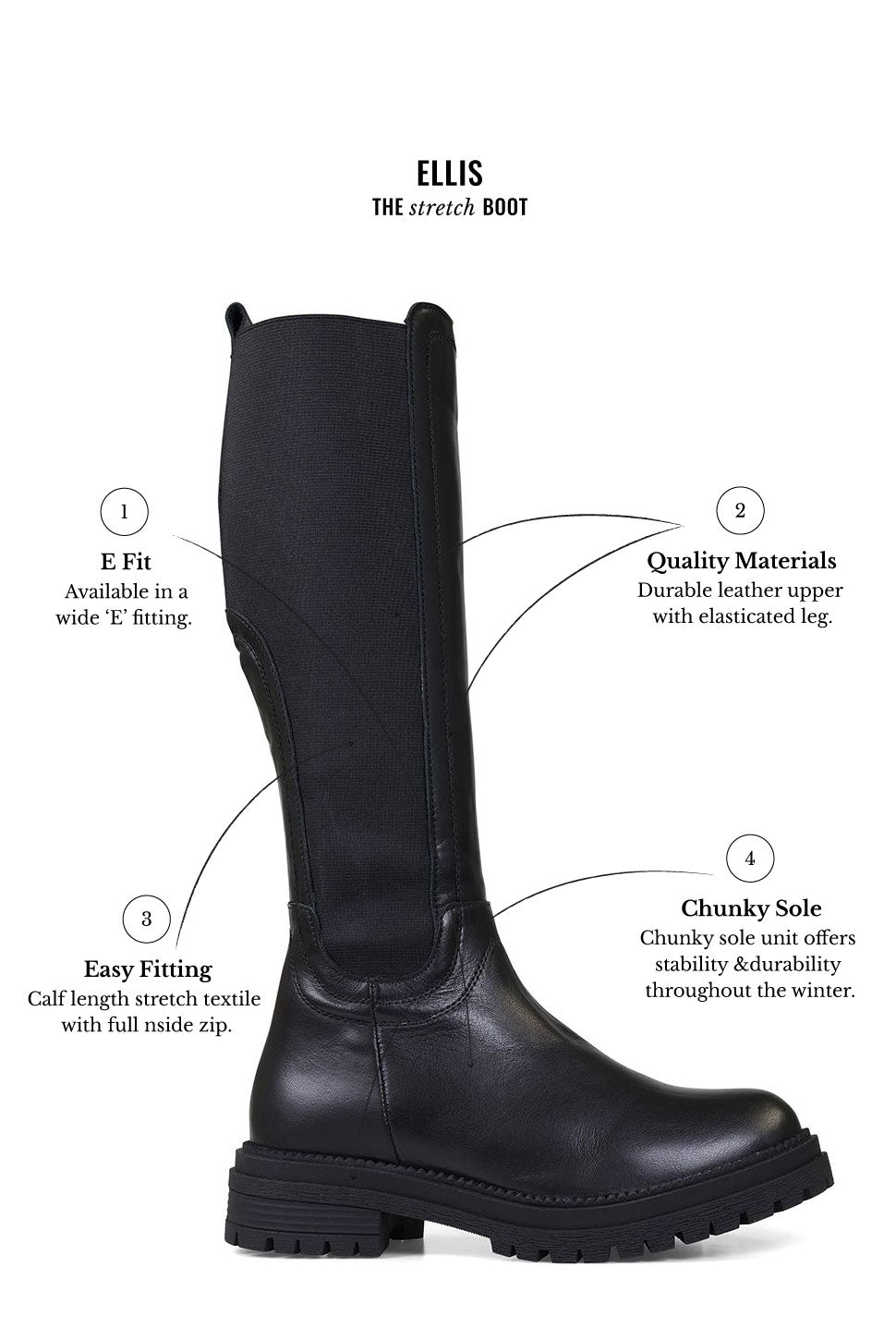 Ellis is a stylish and supportive long boot designed to move with you. Crafted in soft premium leather, this E fit boot features a stretch textile panel that flexes gently around the calf, offering a comfortable, accommodating fit without compromising on style.