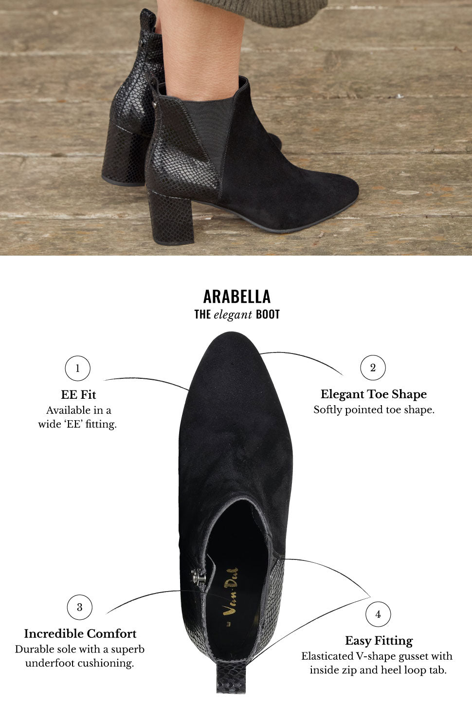 Set on a stable 60mm block heel, this boot provides a confident lift while the EE wide fit ensures a little extra room where you need it most, ideal for all-day wear. The elegant almond toe keeps things refined, making Arabella a perfect choice for office outfits, tailored trousers, or a polished finish to your evening look.