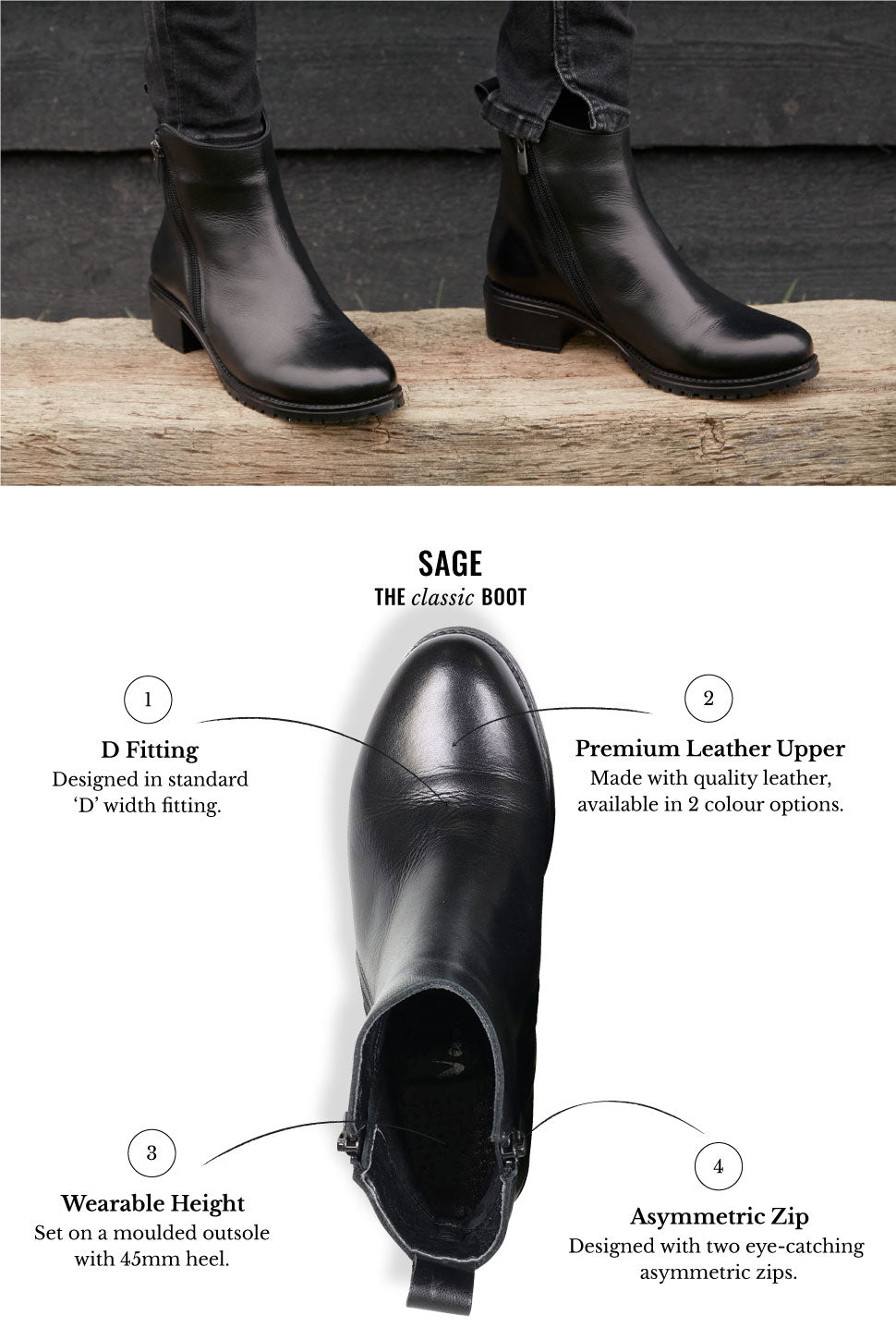 Sage is a beautifully balanced ankle boot combining classic design with modern ease. Crafted in premium leather and finished in a standard D fit, this elegant style features a chic asymmetric outer zip and a practical inner zip for effortless on-and-off wear.