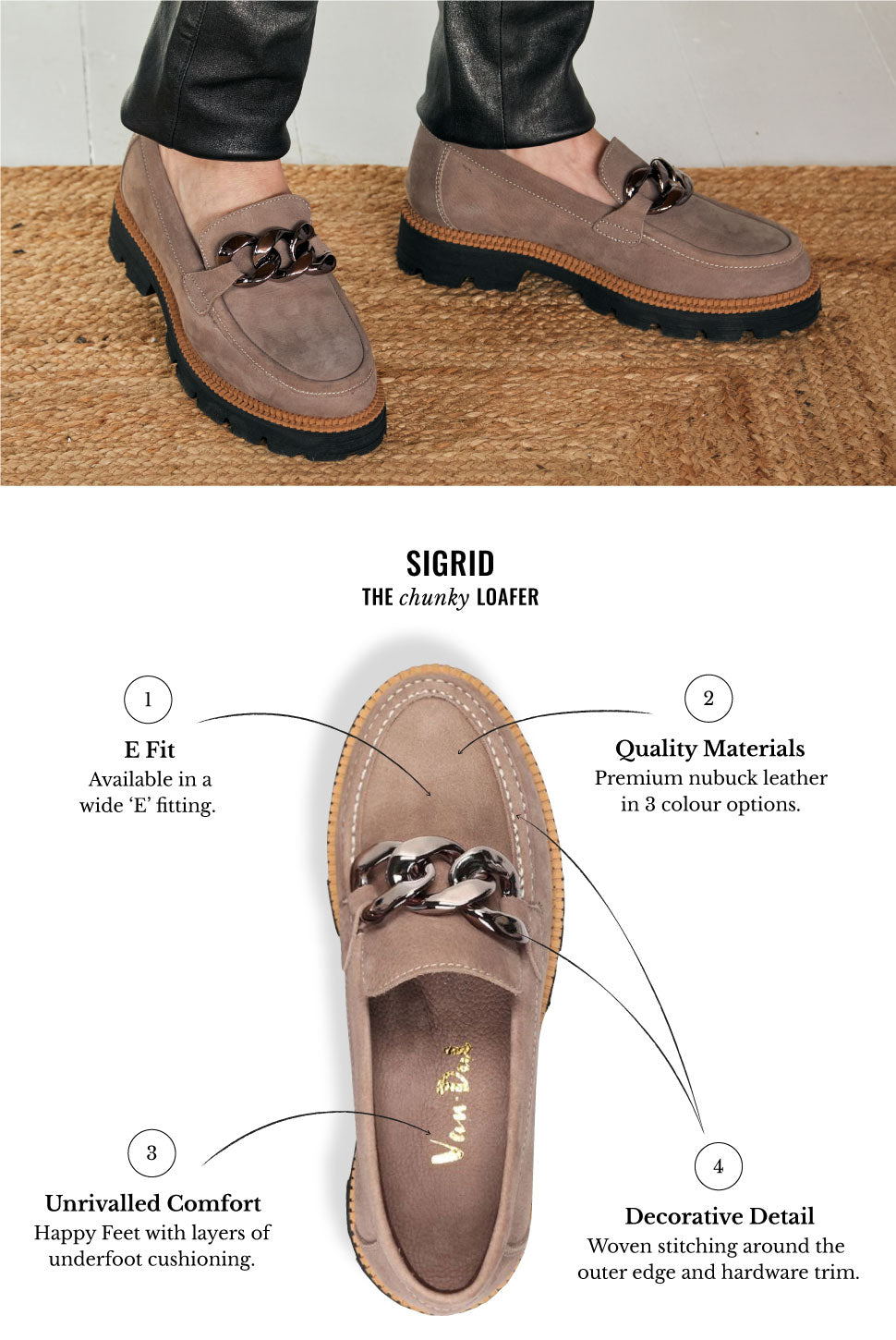 Sigrid brings a modern twist to your everyday wardrobe, crafted from stylish nubuck and elevated on a chunky outsole for a contemporary edge. Designed in a comfortable E wide fit, it offers extra room without sacrificing on sleek style. Decorative woven stitching along the outer edge and a subtle hardware trim add distinctive flair, while cushioned underfoot support ensures all-day comfort.