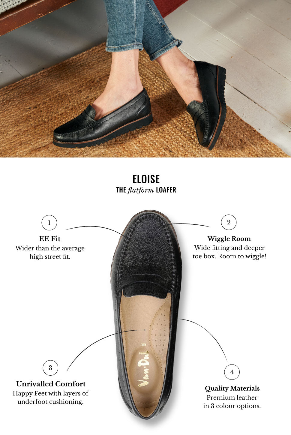 Eloise is an elegant update to your everyday wardrobe, crafted from premium leather and finished with a refined saddle trim for timeless appeal. Designed in a wider EE fit, it provides extra room for all-day comfort without compromising on style. Set on a flexible outsole that moves with you, Eloise blends form and function effortlessly.