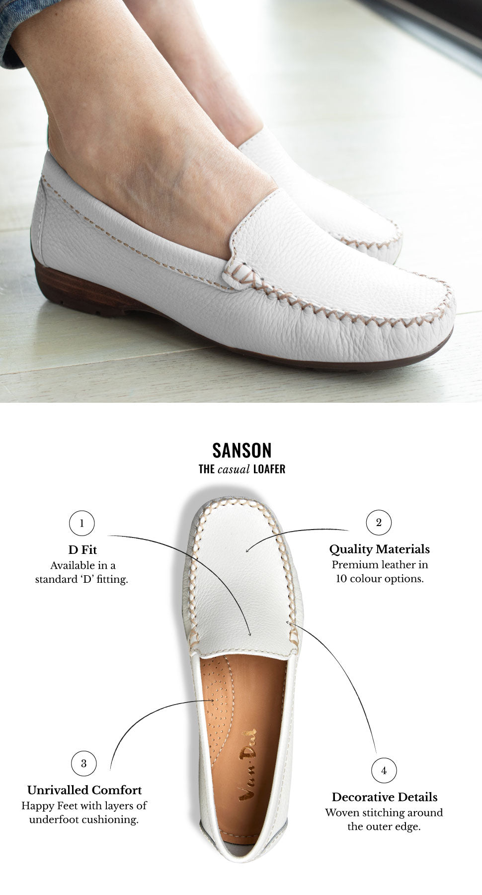 Effortlessly stylish and supremely comfortable, Sanson is a front-of-wardrobe favourite for any occasion. Crafted by Van Dal for a standard D width fit, this casual flat features soft leather with contrasting stitch detailing for a subtle yet distinctive look. A leather lining and cushioned insole ensure all-day comfort, while the durable sole supports natural movement, making Sanson an everyday essential.
