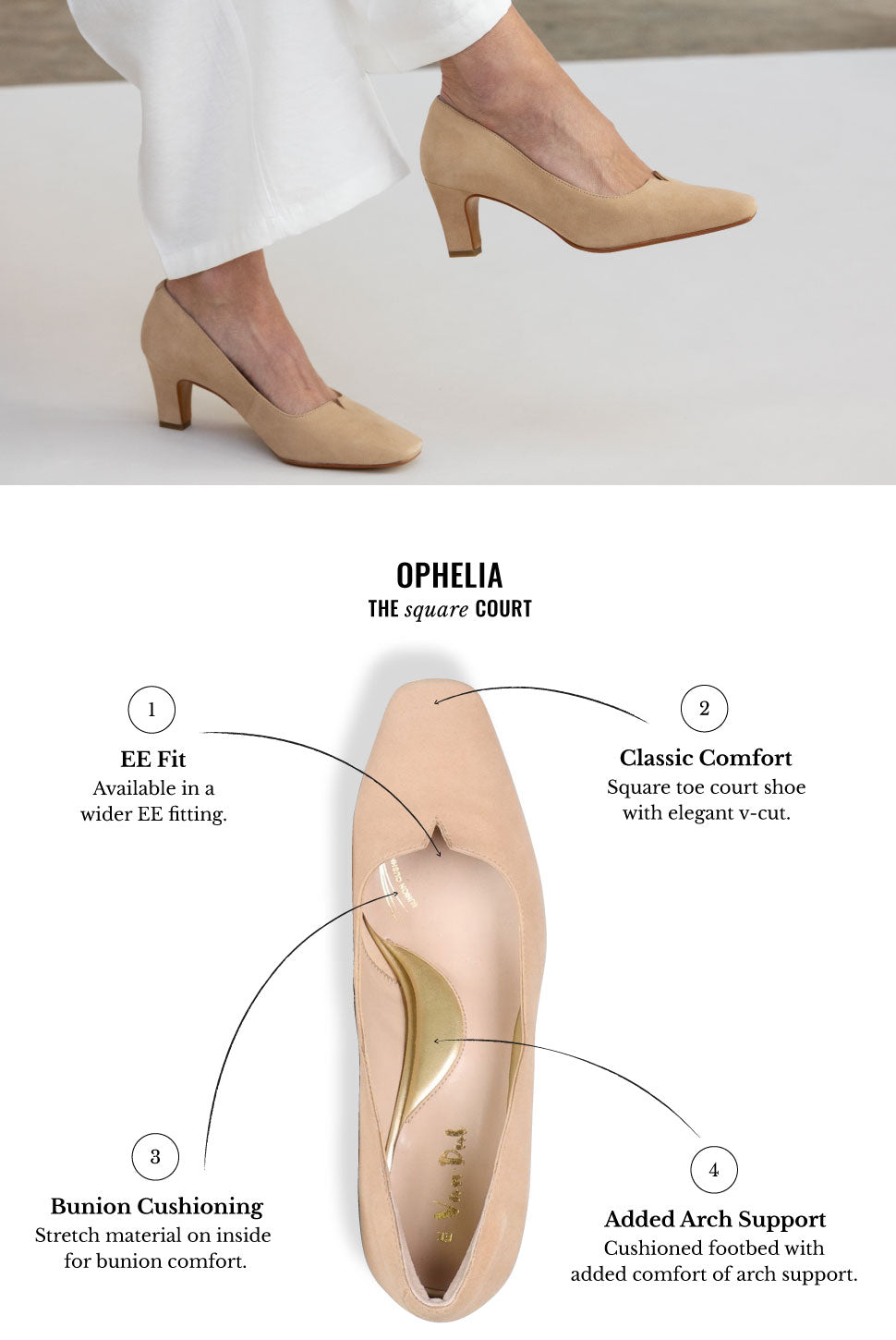 Chic, comfortable, and endlessly versatile, Ophelia is a classic court shoe with a contemporary edge. Designed in a wider EE fit for extra comfort, Ophelia features a flattering square toe and elegant V-cut throat to elongate the foot and enhance the silhouette. Crafted in beautiful leather and set on a stable 65mm block heel, it’s the perfect choice for work, events, or dressing up your everyday looks.